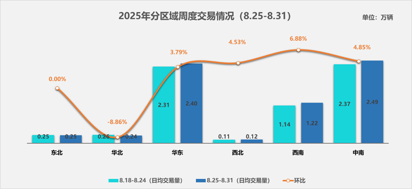 值得注意的是,8月全国多地持续高温及极端天气频发,在一定程度上抑制了二手车交易,传统淡季的特征依然存在。因此,尽管全月交易规模环比上升,单周表现仍存在波动。